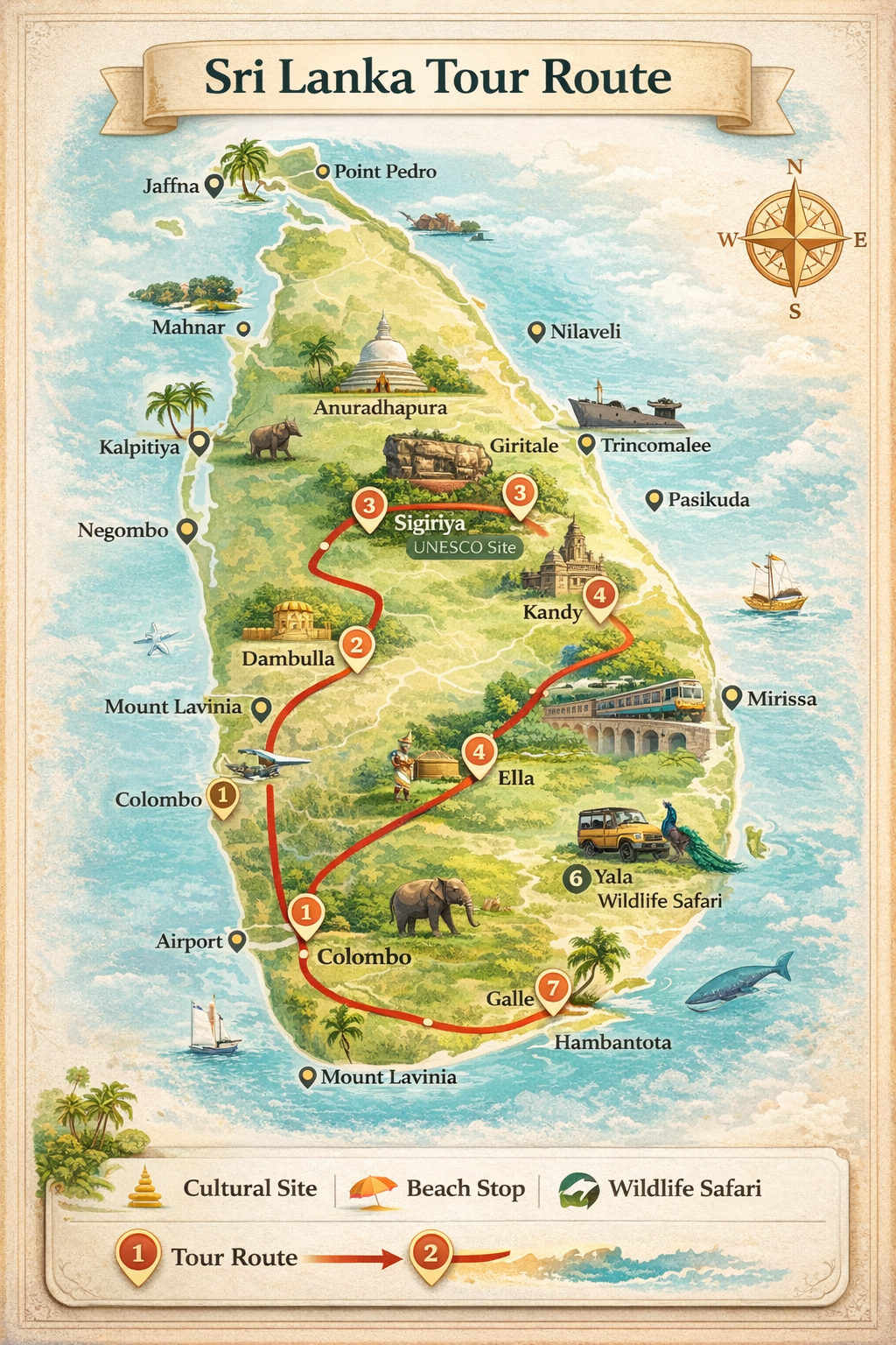 Visualize your journey through Sri Lanka with this thoughtfully designed tour map, highlighting each destination along your route. From cultural landmarks to coastal escapes, this overview provides a clear picture of the experiences that await on your luxury Sri Lanka tour..
